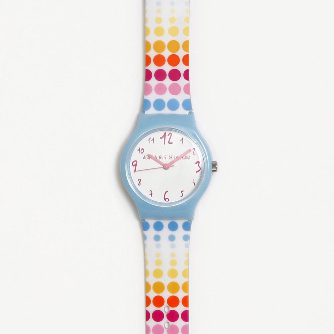 Reloj pequeño de pila con correa de PVC de color blanco con minitopos de colres, la esfera de color blanco con los numero en color fucsia. NO SE PUEDE MOJAR.