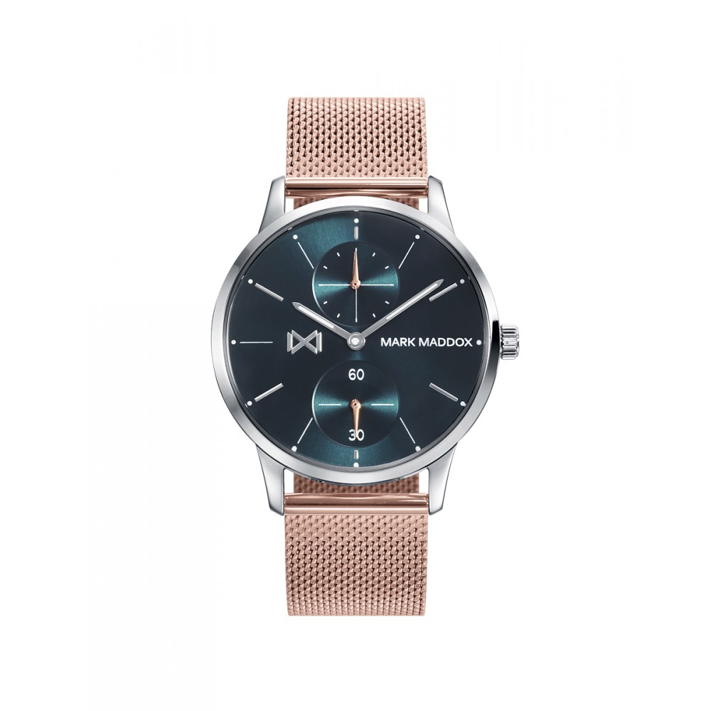 Reloj de Mujer Mark Maddox Northern multifunción de acero y malla milanesa con IP rosa. Esfera verde, contadores a las 6 y 12, índices en blanco y segunderos en rosado,