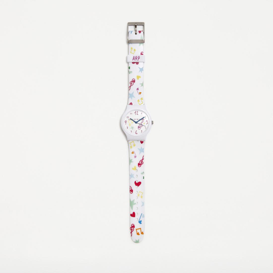 Reloj pequeño de pila con correa de PVC estampado con iconos de colores sobr fondo de color blanco y la esfera blanca con los numero de color fucsia. NO SE PUEDE MOJAR.