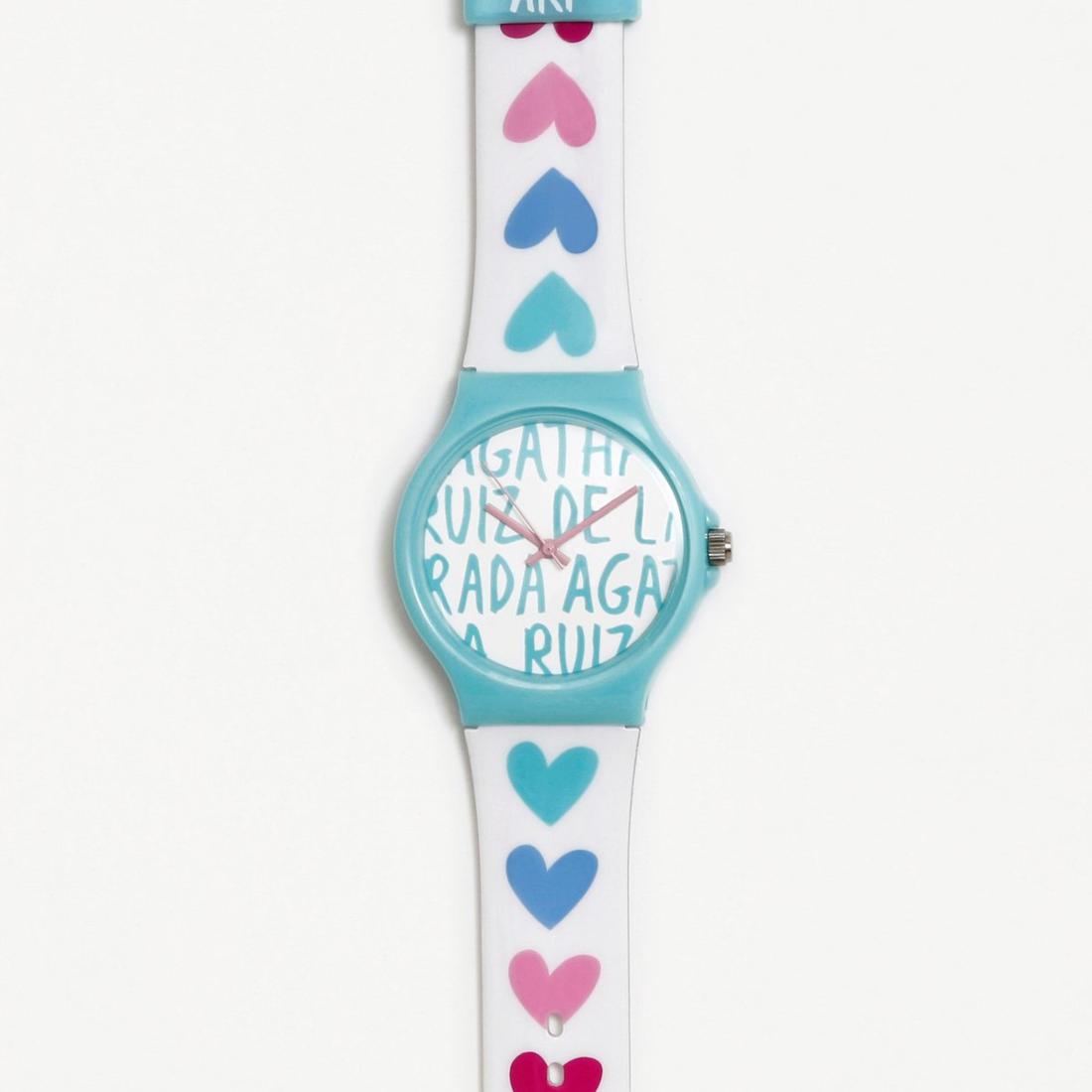 Reloj grande de pila con correa de PVC de color blanco con corazones en fila de colores y la esfera blanca estampada con agatha ruiz de la prada en color turquesa, sin números y las agujas de color rosa. NO SE PUEDE MOJAR.