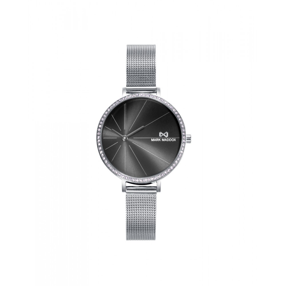 Reloj informal de Mujer Mark Maddox Alfama, dos agujas, caja y malla milanesa de acero, bisel de caja con circonitas, esfera negra y agujas en color plata.