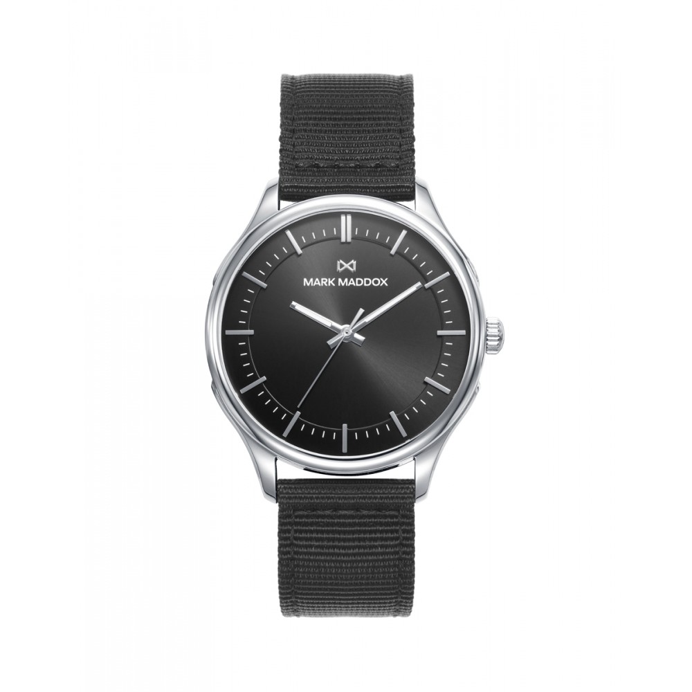 Reloj Hombre Mark Maddox Greenwich,tres agujas, caja de acero con correa de nylon y efera en color negro .