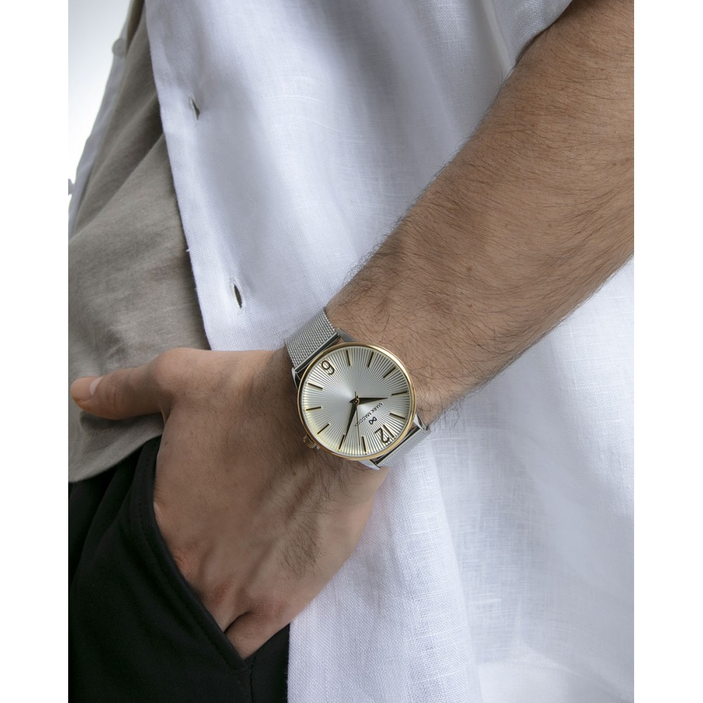 Sofisticación clásica en un reloj de hombre tres agujas con elegante caja bitono de acero e Ip dorado. Su malla milanesa de acero aporta comodidad y estilo, mientras que la esfera plateada resalta con índices, números árabes y agujas horarias en Ip dorado. Equipado con cristal mineral resistente, este modelo Mark Maddox combina lujo y versatilidad para acompañarte en cada ocasión.