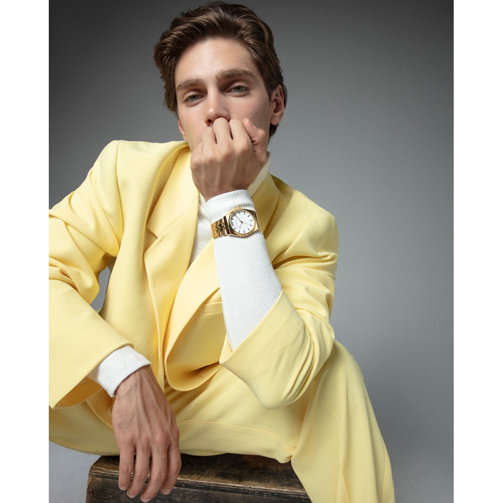 Este reloj de hombre de tres agujas destaca por su elegancia y estilo clásico. La caja y el brazalete de acero con acabado IP dorado le aportan un toque lujoso y refinado. La esfera blanca, adornada con índices y agujas horarias en color dorado, crea un contraste sofisticado que realza su diseño. El cristal mineral asegura durabilidad y protección, haciendo de este reloj una opción ideal para el hombre que busca un accesorio atemporal que combine funcionalidad y distinción.