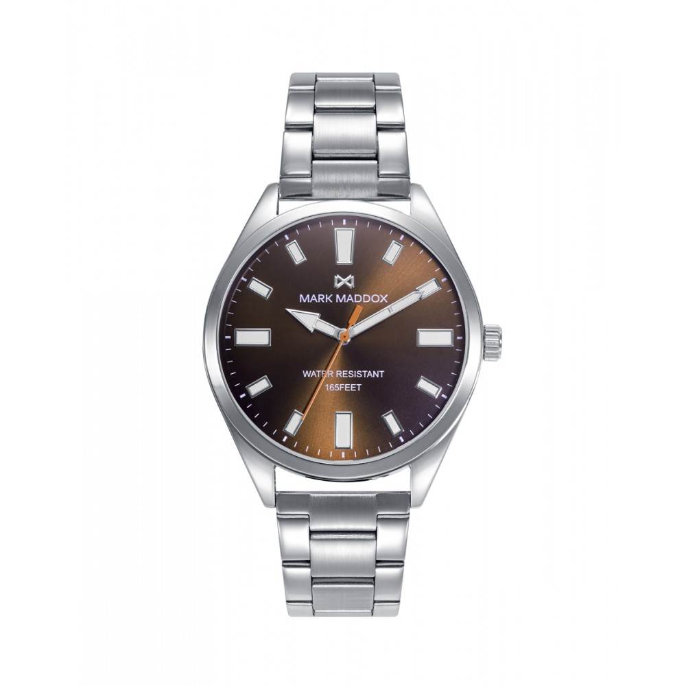 Reloj informal de Hombre Mark Maddox Marais, tres agujas, caja y brazalete de acero, esfera marrón con índices y agujas de horas y minutos en color plata con luminous, aguja de segundos en color naranja.