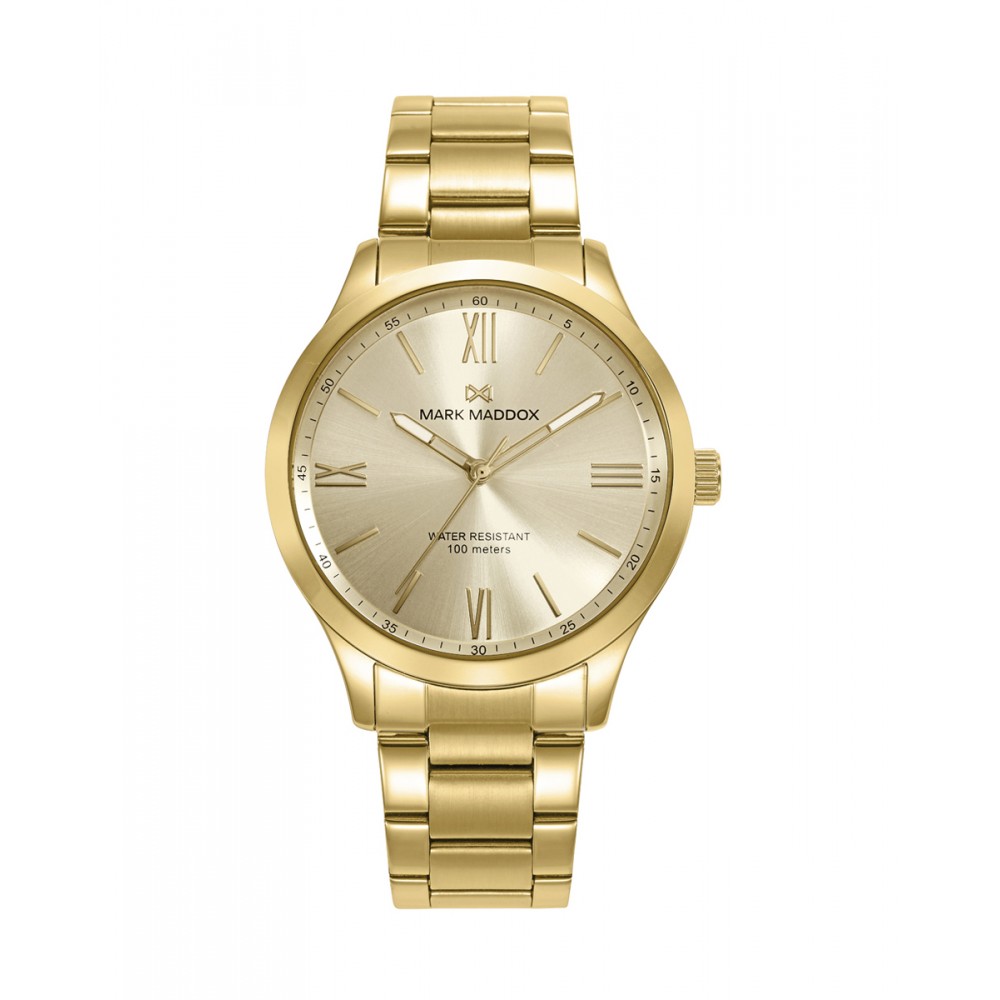Este reloj de hombre de tres agujas combina lujo y estilo clásico. La caja y el brazalete de acero con acabado IP dorado aportan una apariencia elegante y sofisticada. La esfera dorada, decorada con números romanos e índices, añade un toque atemporal, mientras que las agujas horarias en color dorado completan el diseño armoniosamente. El cristal mineral asegura durabilidad y protección, haciendo de este reloj una opción ideal para el hombre que busca un accesorio refinado y distinguido, perfecto tanto para el uso diario como para ocasiones especiales.