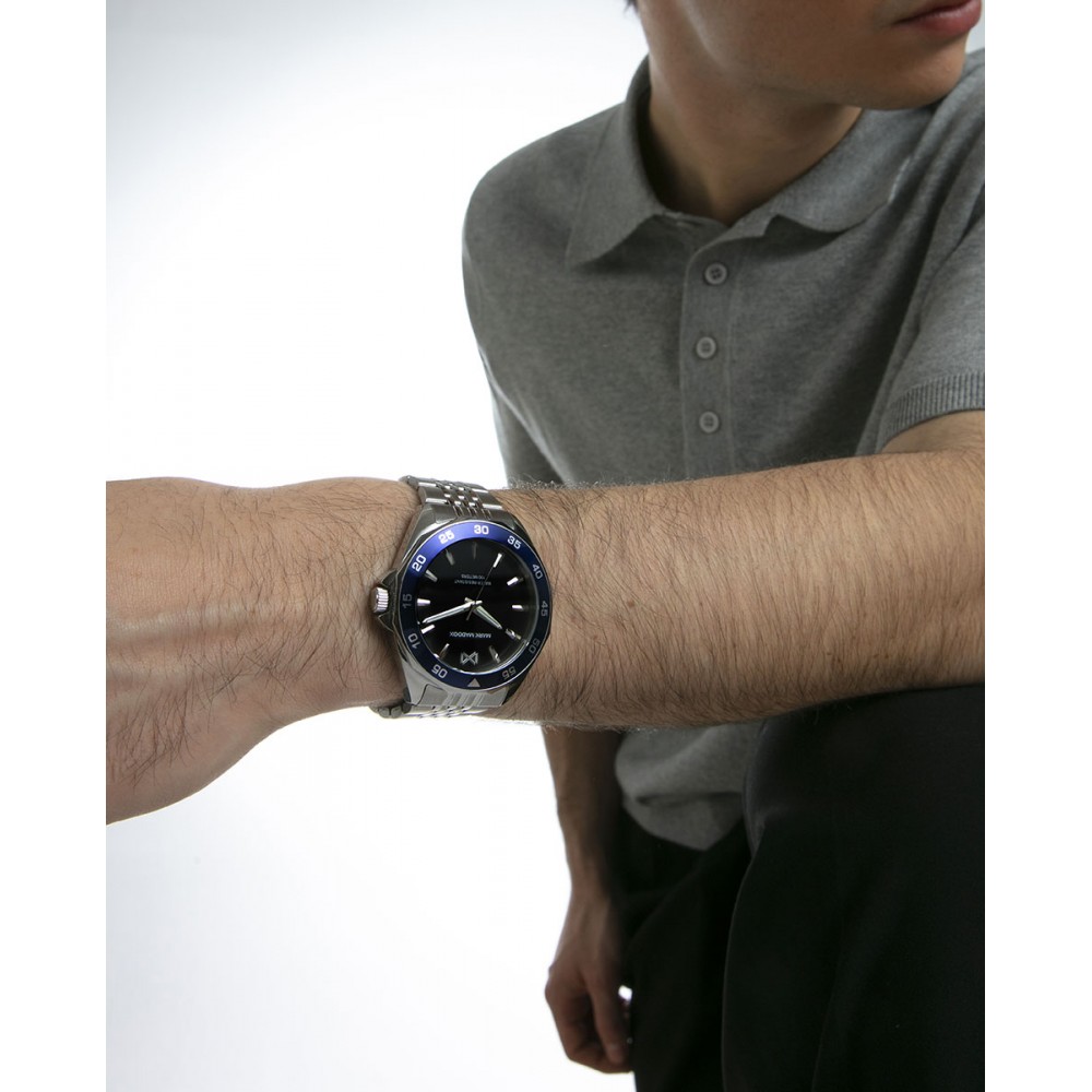 Aporta estilo y distinción a tu muñeca con este reloj para hombre de tres agujas con caja de acero y bisel en azul, resistente al agua hasta 10 ATM. Su elegante esfera negra con índices y agujas horarias en tono plata garantiza una lectura clara y precisa. Equipado con brazalete de acero resistente y cristal mineral, este modelo Mark Maddox es sinónimo de calidad, confort y sofisticación para cualquier ocasión.