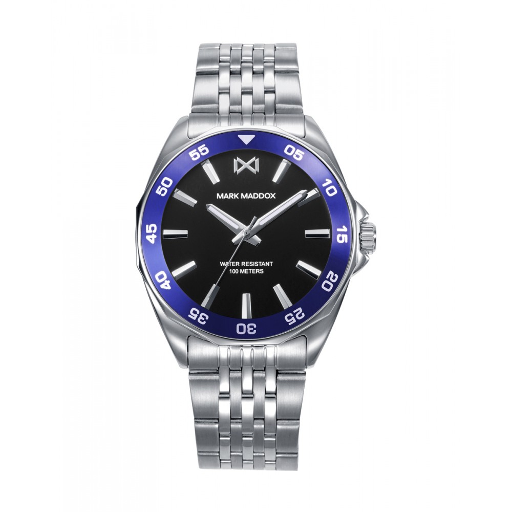 Dale personalidad a tu look con este reloj femenino de tres agujas, con caja de acero y elegante bisel en azul. Su esfera negra con índices y agujas horarias en plata proporciona estilo y facilidad de lectura. Hermético hasta 10 ATM y equipado con brazalete resistente de acero y cristal mineral, este modelo Mark Maddox combina durabilidad, diseño y sofisticación para acompañarte en cada momento.