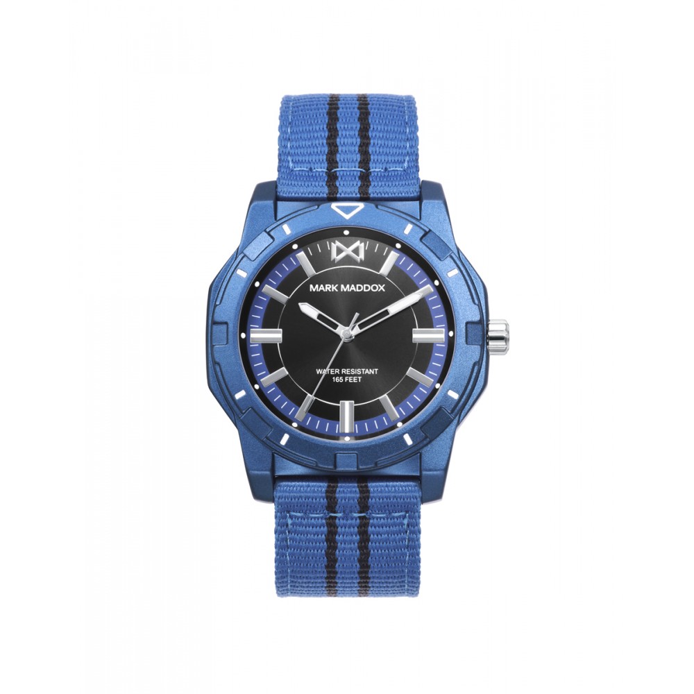 Reloj Mark Maddox Hombre Mission, tres agujas caja de aluminio en color azul con correa de nylony azul y esfera negra.