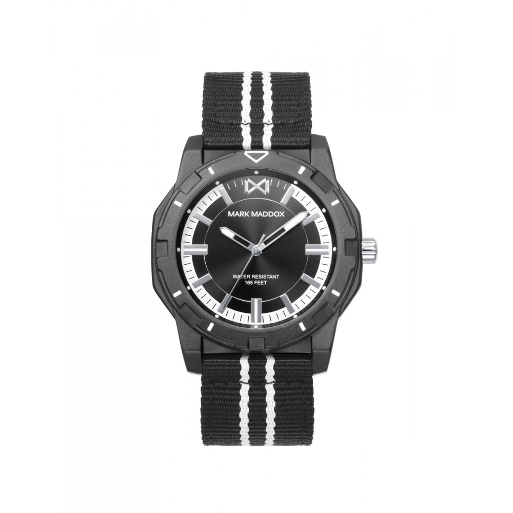 Reloj Mark Maddox Hombre Mission, tres agujas caja de aluminio en color negro con correa de nylony y esfera negra .