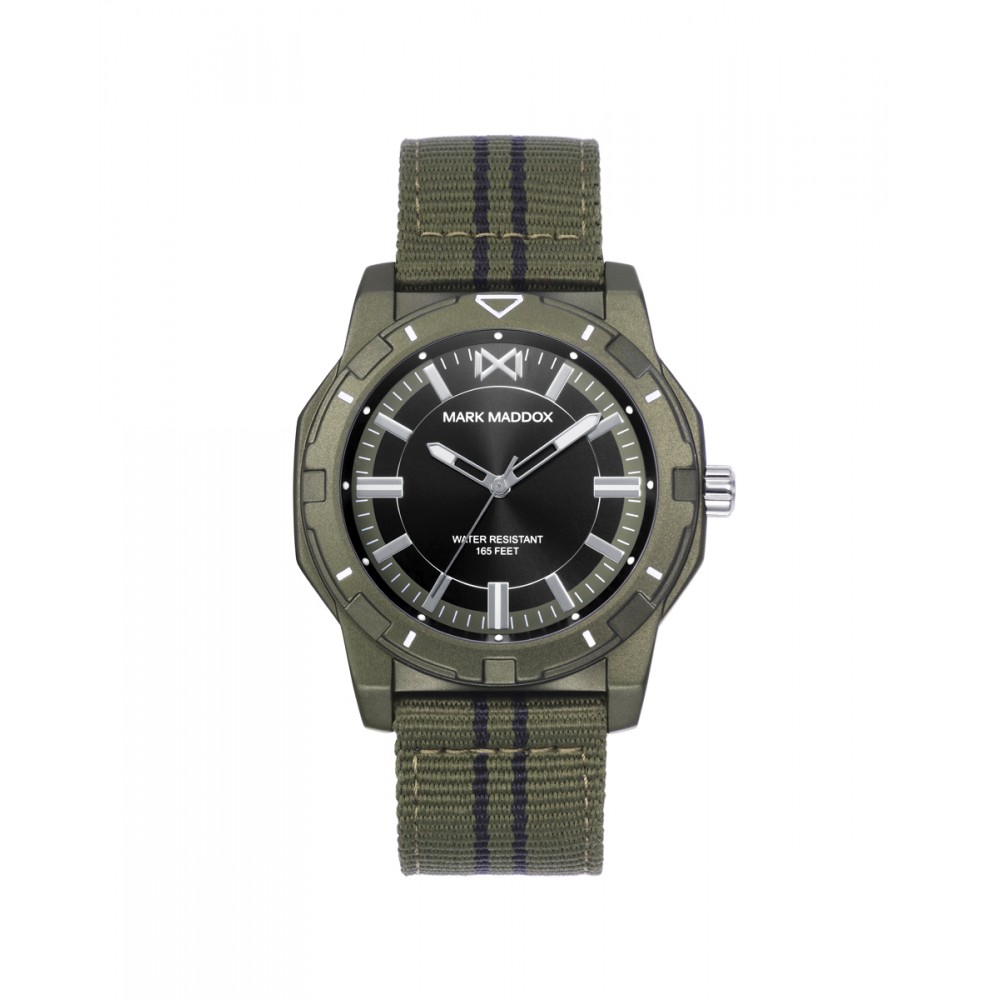 Reloj Mark Maddox Hombre Mission, tres agujas caja de aluminio con correa de nylony verde y esfera verde.