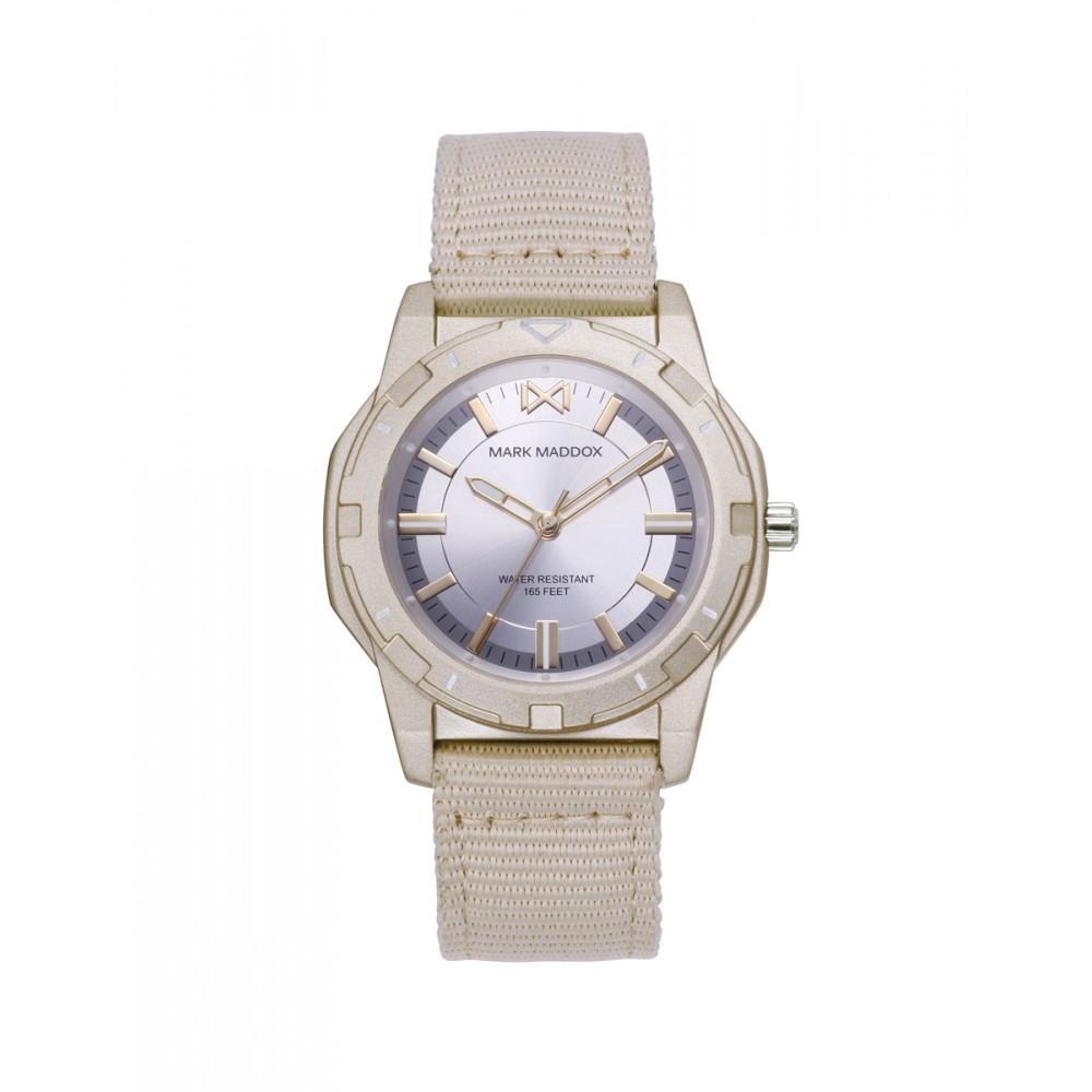 Reloj Mujer Mark Maddox Mission, tres agujas, caja de aluminio y correa en color beige, esfera en color plateada.