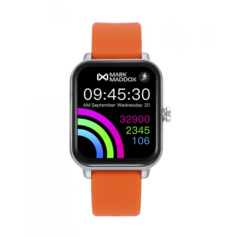 Smartwatch Mark Maddox Smartnow, caja de policarbonato plateado y correa de silicona naranja, pantalla táctil, son compatibles con teléfonos con un sistema operativo Android 11 o superior o iOS 11 o superior. Las funciones admitidas pueden variar entre plataformas y países. Funciones, aviso de llamada, y podras ver notificaciones, mensajes, presión arterial, oxígeno en sangre, cuentapasos, distancia realizada, gestión de deportes,función GPS a través de la App y sincronización con la App de Strava, cronómetro, control de calidad de sueño, alarmas, cámara remota, control de la música de tu móvil, localizar tu teléfono.
