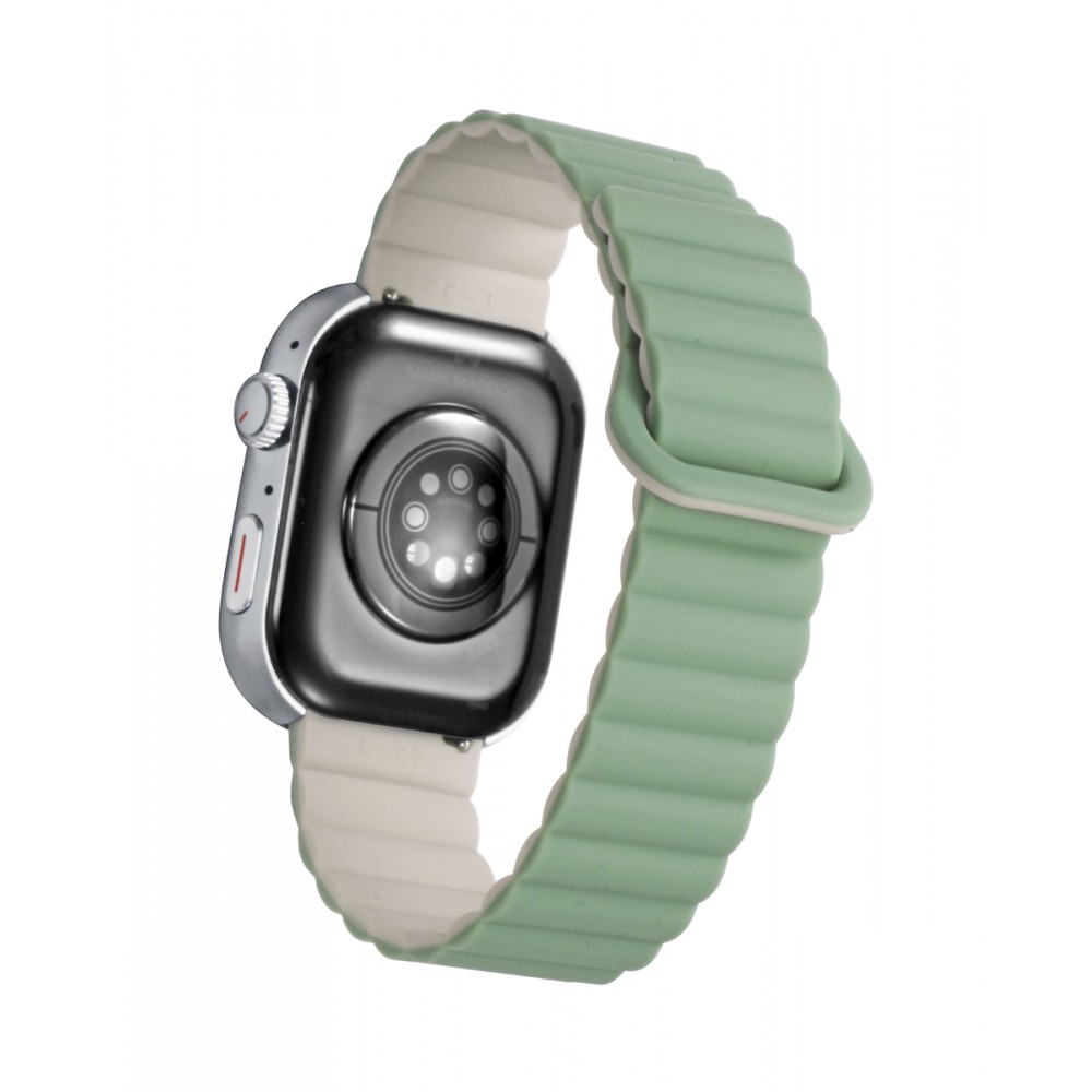 Reloj smart que combina un diseño moderno con un toque fresco gracias a su caja metálica plateada y correa de silicona verde. Su pantalla táctil permite recibir llamadas, mensajes y notificaciones, además de medir oxígeno, pasos y sueño. Un reloj funcional, versátil y con estilo para acompañarte en cada momento del día.