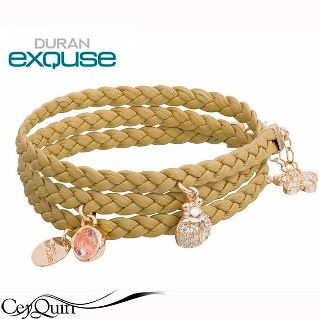 - Pulsera fabricada en cuero trenzado de color beige, y plata bañada en oro rosé.