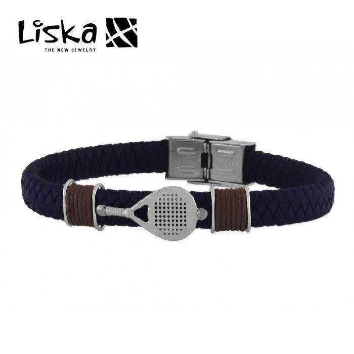 Pulsera de la marca Liska fabricada en acero inoxidable, hilo marrón y piel azul.