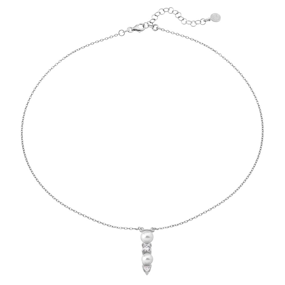 Colgante con forma de punta de flecha formada por circonitas y perlas que termina con una circonita triangular. Un diseño que evoca a la inconografía de la diosa Satis. Este colgane de plata rodiada con estilo atemporal es el regalo ideal para el día de la madre