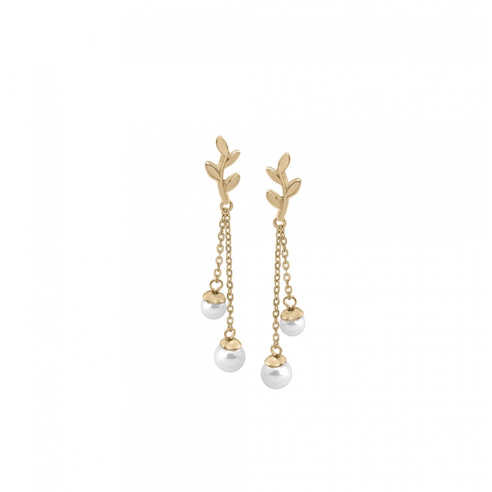 Pendientes largos con pincho en plata dorada, perlas redondas blancas de 4/5mm.