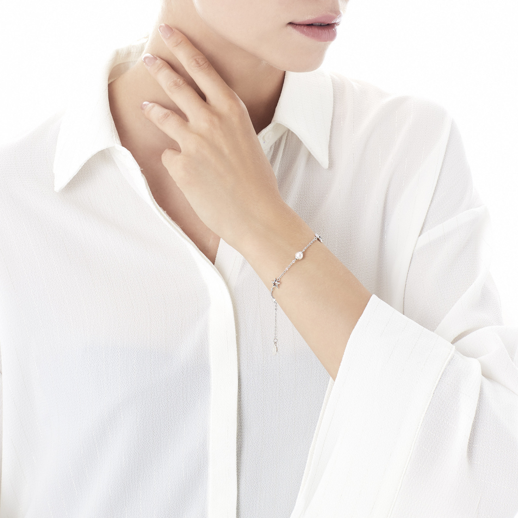 Luce un diseño moderno y atrevido en tu muñeca con el brazalete Rockstar. El diseño con baño rodio incorpora las perlas Majorica con estrellas asimétricas. Perfecta para diario o para regalar.