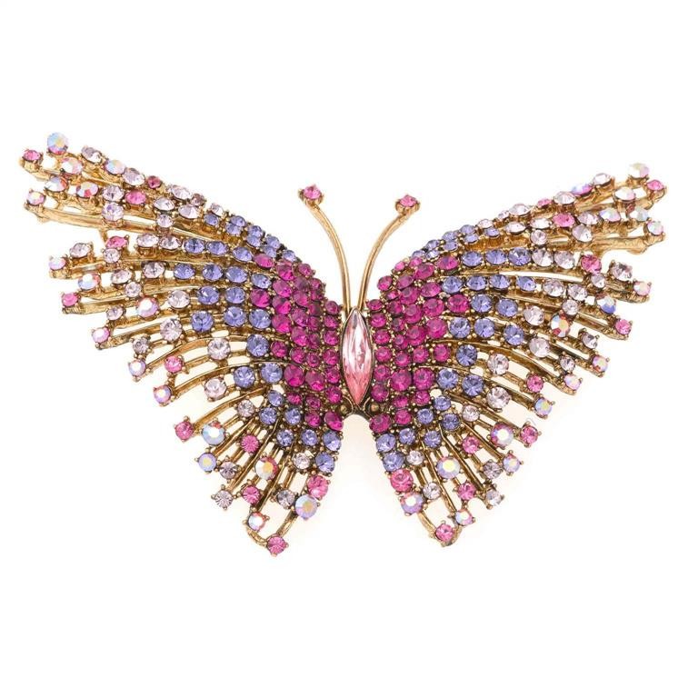 broche alta bisuteria metal chapado dorado mariposa cristales fucsias, lilas y rosas