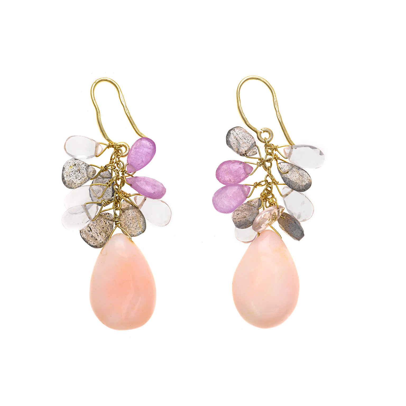 pendientes plata chapado dorado lagrimas opalo rosa, labradorita, rutilato y turmalina rosa