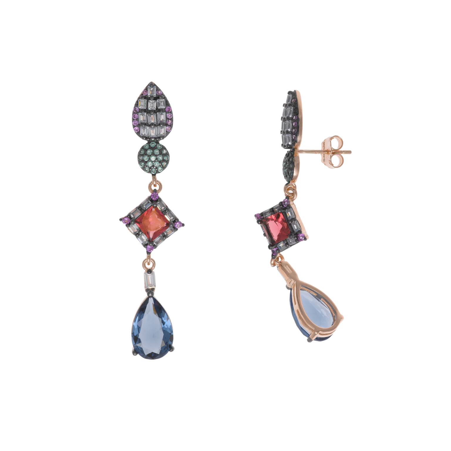 pendientes plata chapado rosa lagrima baguets blancas circonitas fucsias, circulo circonitas verdes, rombo baguets blancas cristal fucsia, lagrima azul bajo rutenio