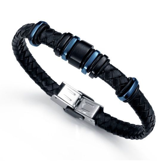 Pulsera Viceroy Fashion para hombre fabricada en cuero trenzado negro , y acero inoxidable Ip negro y Ip azul eléctrico.