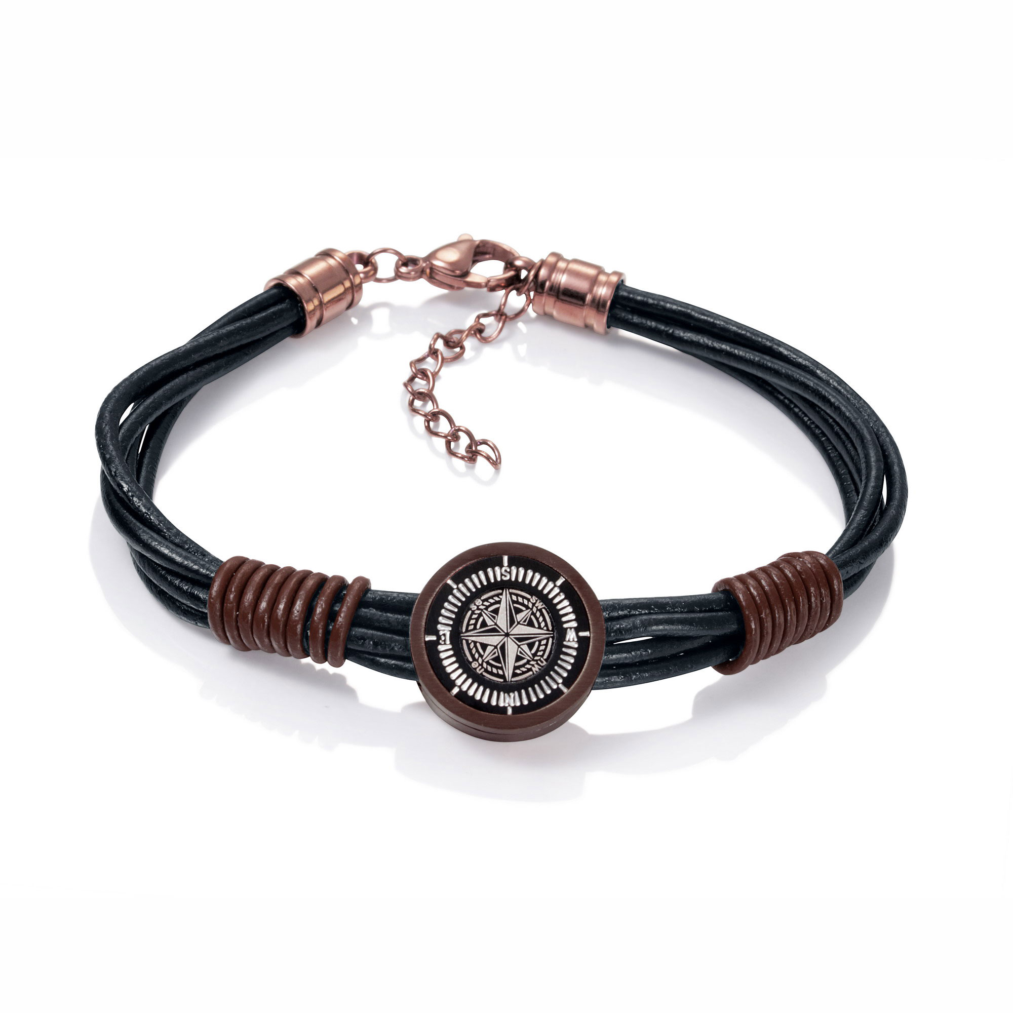 Pulsera Viceroy Fashion fabricada en acero inoxidable Ip marrón y cuero. Esta original pulsera con "la rosa de los vientos" está montada con 2 filas de cuero marrón. . El cierre es de acero inoxidable Ip marrón con sistema de mosquetón.