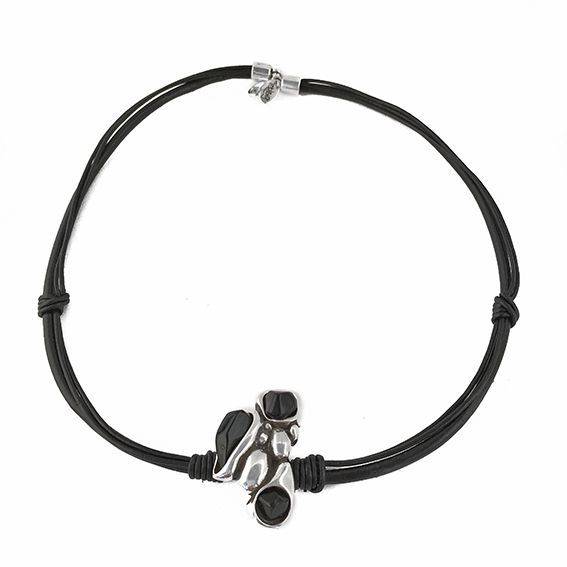 Collar de la marca Tra-la-ra fabricado en zamak y cuero negro.