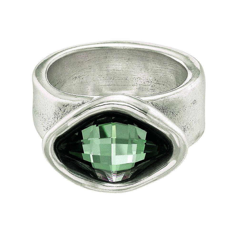 Anillo ancho de metal bañado en plata con un cristal de Swarovski horizontal en el centro en forma de rombo color gris.