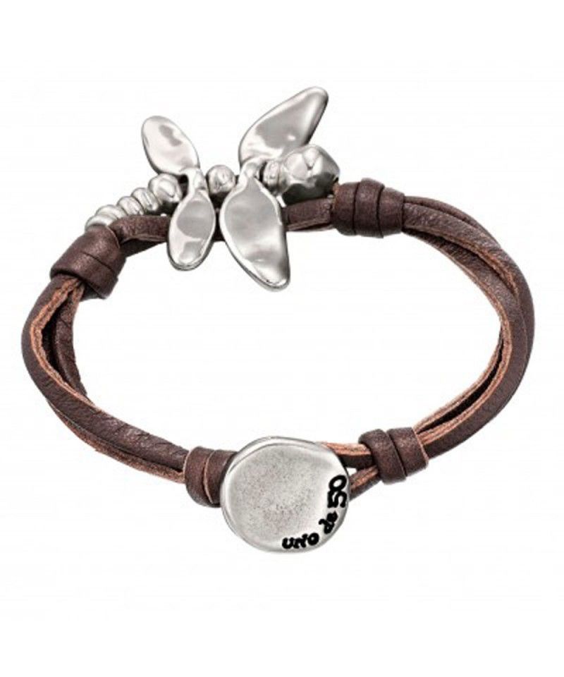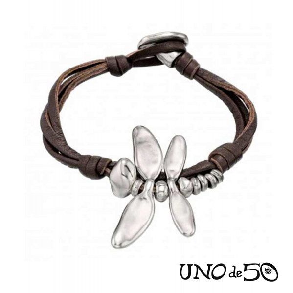 Pulsera Uno de 50 mujer PUL1366MARMTL0M. Modelo Circulando. La pulsera es de cuero marrón y está decorada con un colgante en forma de libélula. La talla de la pulsera es una M que equivale a 17 cm de largo. El artículo está elaborado de manera artesanal en España