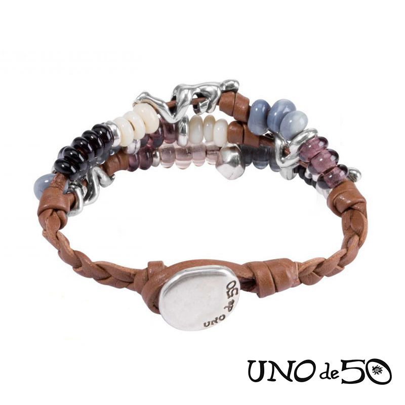 Pulsera de la marca UNO DE 50, elaborada en cuero con metal bañado en plata fina.Fabricado 100% en España.