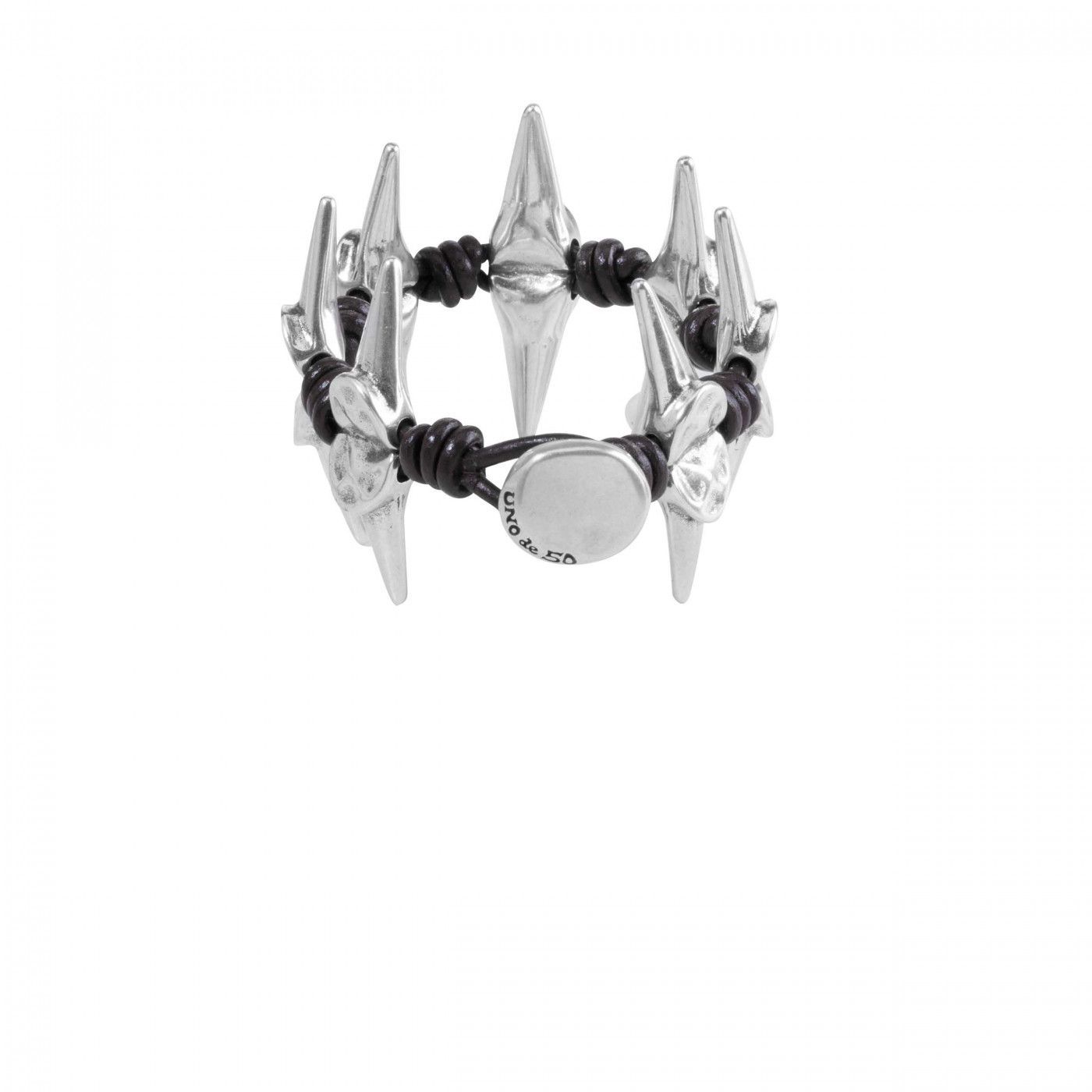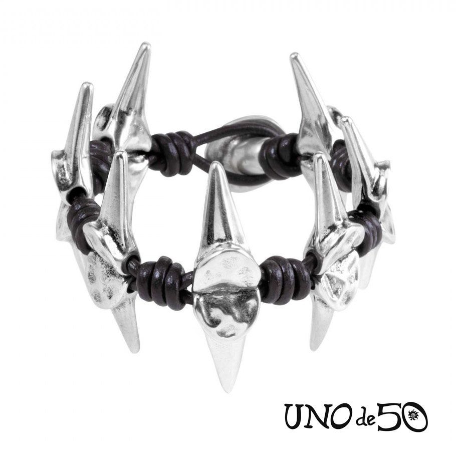 Pulsera con diseño de cuero y metal bañado en plata compuesta por piezas también metálicas con forma de punta, alternadas con nudos en el cordón. El acabado trasgresor que presenta transmite la personalidad rebelde de la firma, y es perfecta para quienes no deseen pasar desapercibidos. Elaborada a mano en España.