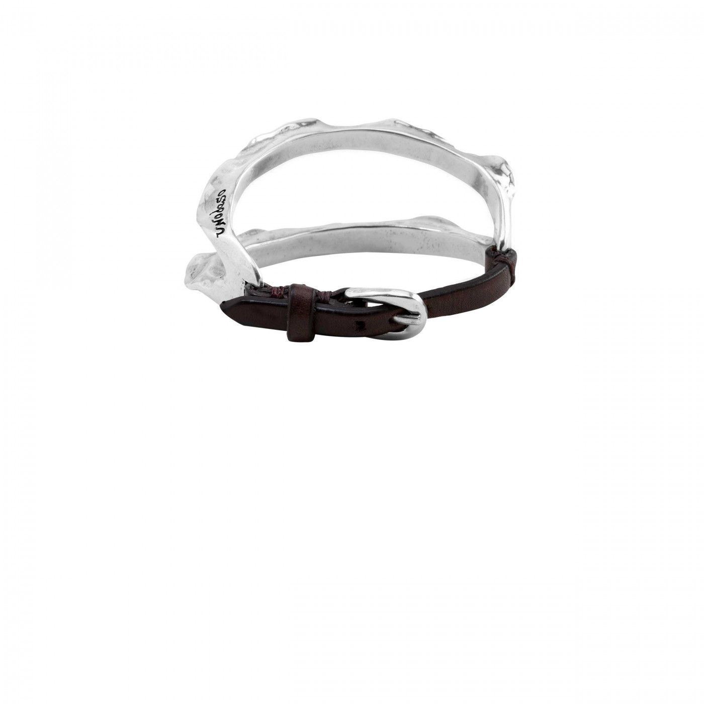 Pulsera de metal con baño de plata y original cierre de cuero con hebilla. Con un ingenioso diseño de acabado irregular, que refleja su elaboración artesanal. Una pulsera atrevida que no pasa desapercibida y que aporta un estilo único. Hecha íntegramente en España de forma manual.