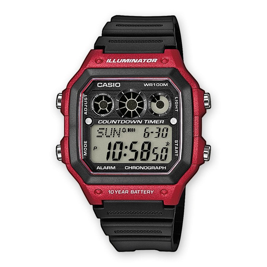 Accuracy +/- 30 sec Alarms Alarma diaria Calendario automático Si Correa Correa de resina Duración de la batería 10 Año(s) Tipo de pila CR2025 Marca CASIO Collection Sonido de los botones activado/desactivado Si Caja Caja de resina Color de la pulsera negro Color de la carcasa rojo Color de la esfera negro Digital / Analógico Digital Género Hombres Iluminador Luz LED Recycling fee 0,02 € Estilo deportivo Función de hora universal Función de hora universal La resistencia al agua 10 bar Dimensiones (Al x An x Pr) 45,0 mm x 42,1 mm x 12,5 mm Peso 39,0 g