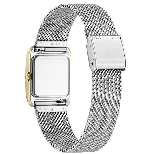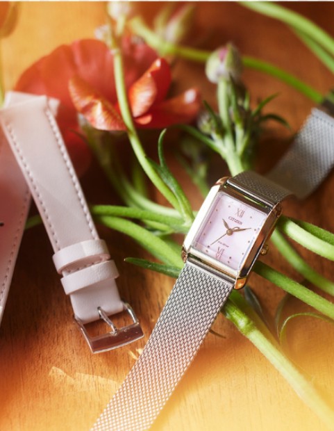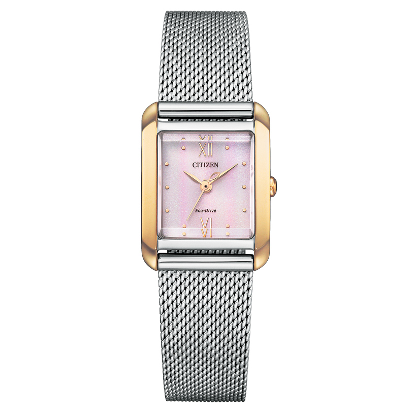 Caja de acero 21,5 x 28,4 mm., 7,5mm. de grosor. Brazalete de acero tipo mesh + correa Ecopet color rosa intercambiables. Cristal de zafiro curvo. WR 5 bar.