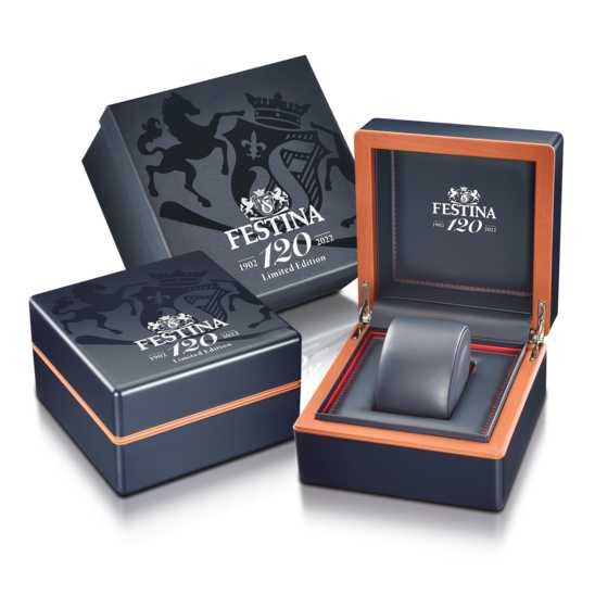 Celebre el 120 aniversario de Festina con un reloj edición especial, fabricado en Suiza con precisión y elegancia. Su movimiento Balancier visible automático, hecho en las propias manufacturas suizas de Festina, garantiza un tiempo exacto. Fabricado en acero inoxidable 316l, presenta una sofisticada esfera azul protegida por cristal de zafiro que muestra una elegante bandera española para honorar los orígenes de la marca. La correa de cuero azul con cierre de doble pulsador complementa su diseño exclusivo.