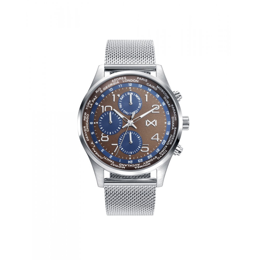 Reloj de Hombre Mark Maddox Mission multifunción, caja de acero. Esfera marrón y azul, contadores a las 6, 9 y 12 en azul, indicadores en acero y malla milanesa