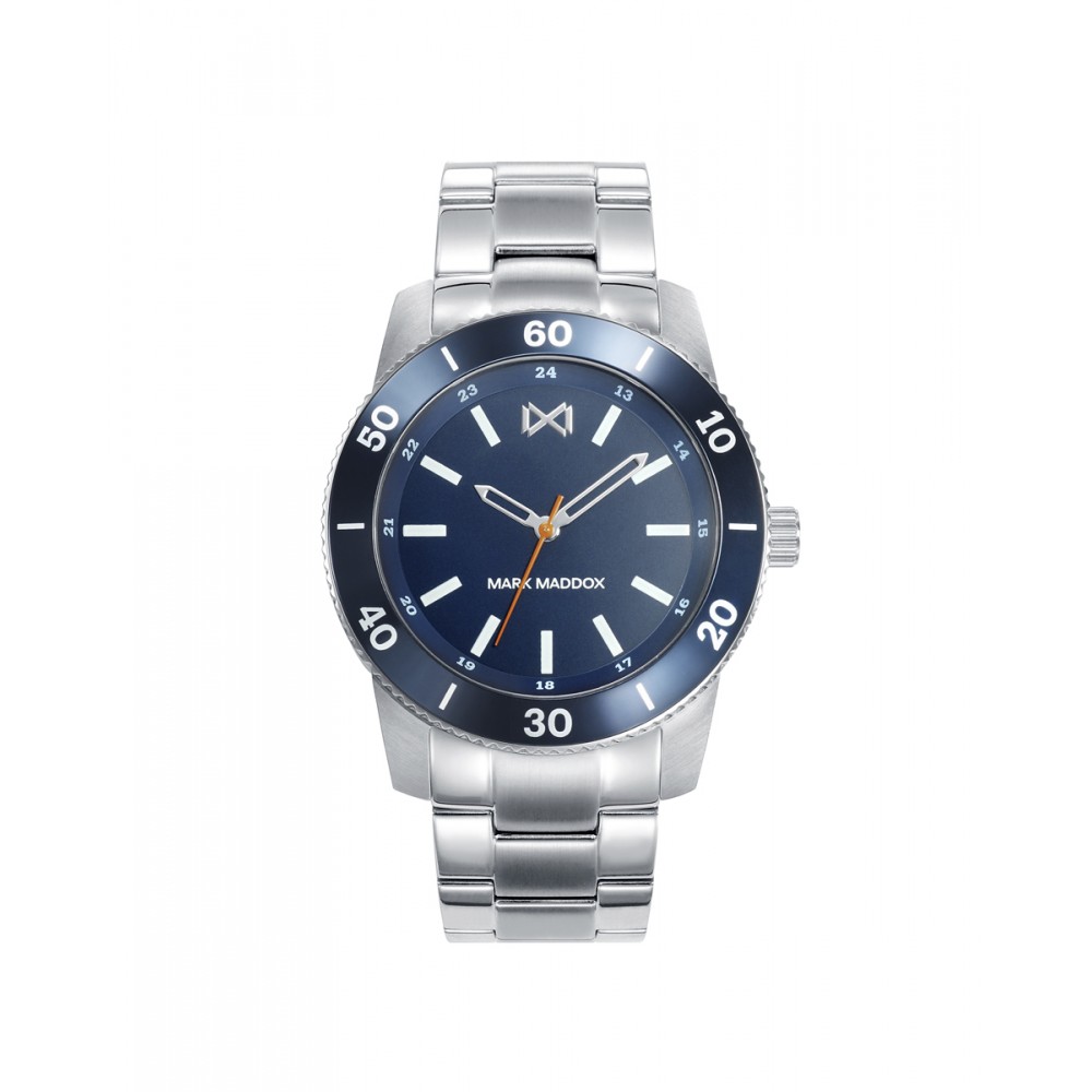 Reloj de Hombre Mark Maddox Mission tres agujas con caja de acero y brazalete sólido integrado del mismo material. El bisel es de aluminio azul, esfera del mismo color con los índices en blanco y el segundero naranja