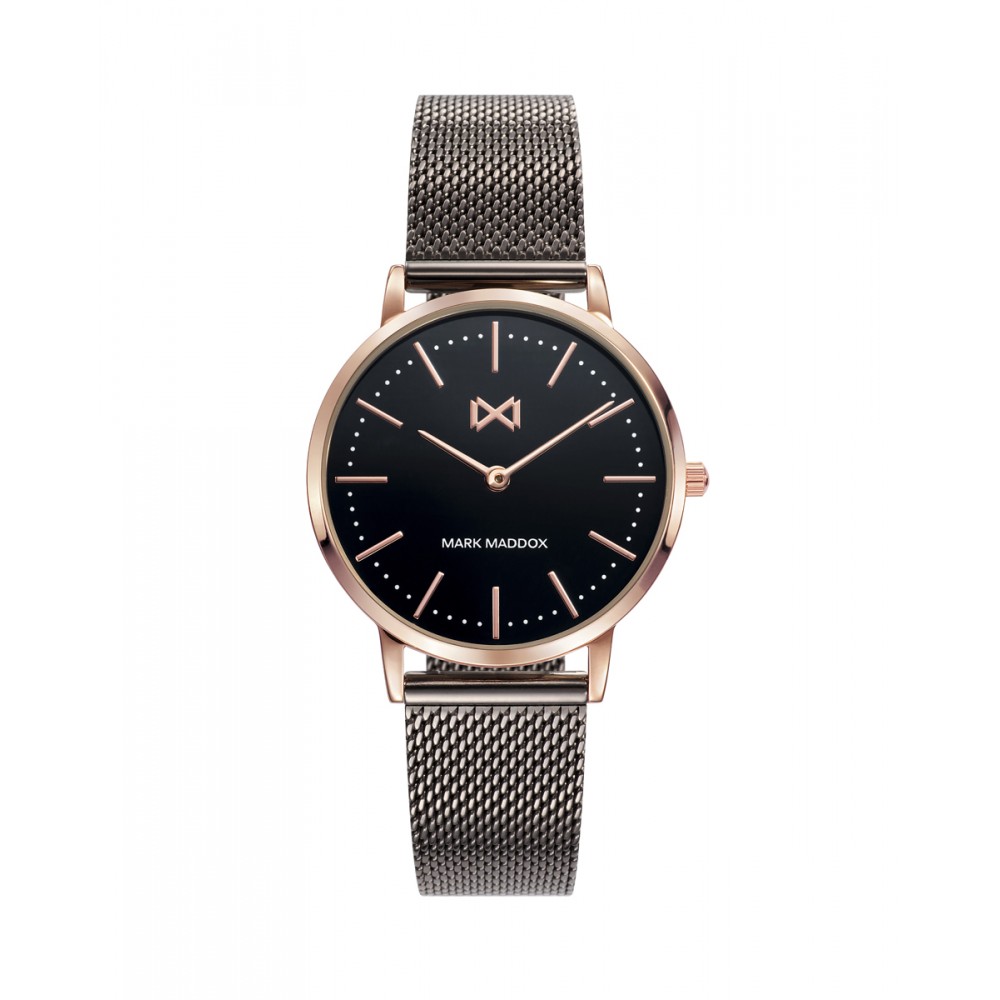 Reloj de mujer Mark Maddox Greenwich dos agujas de acero extraplano. Con IP negro en la malla milanesa y IP rosa en la caja. La esfera es color negro y los indicadores en rosa.