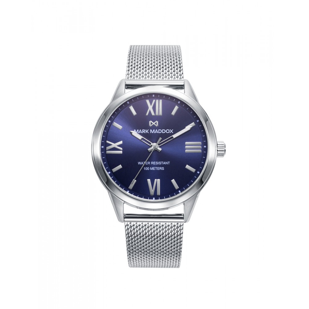 Reloj de mujer Marais Mark Maddox tres agujas con caja y malla milanesa en acero, esfera azul con agujas en color blanco.