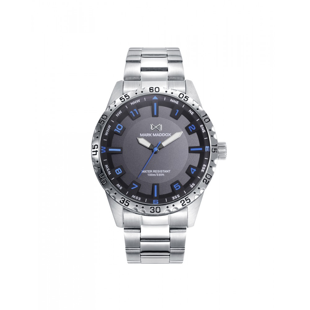 Reloj de hombre Mark Maddox MISSION con esfera gris, índices azules y brazalete de acero con cierre desplegable mediante pulsadores. Sumergible 100 metros.