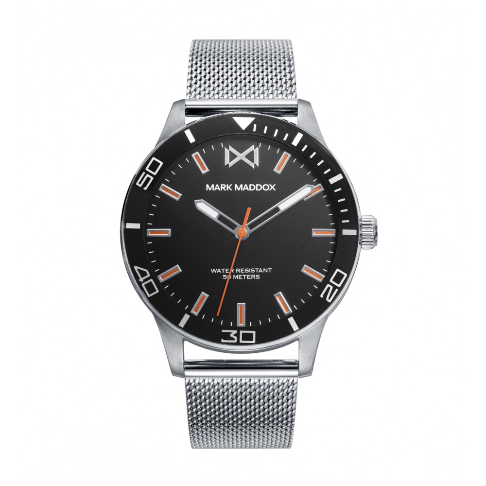 Pack de Hombre Mark Maddox Mission con reloj tres agujas y caja de acero y malla milanesa, esfera negra con indices y aguja de segundo y pulsera de cuero con motivo en acero