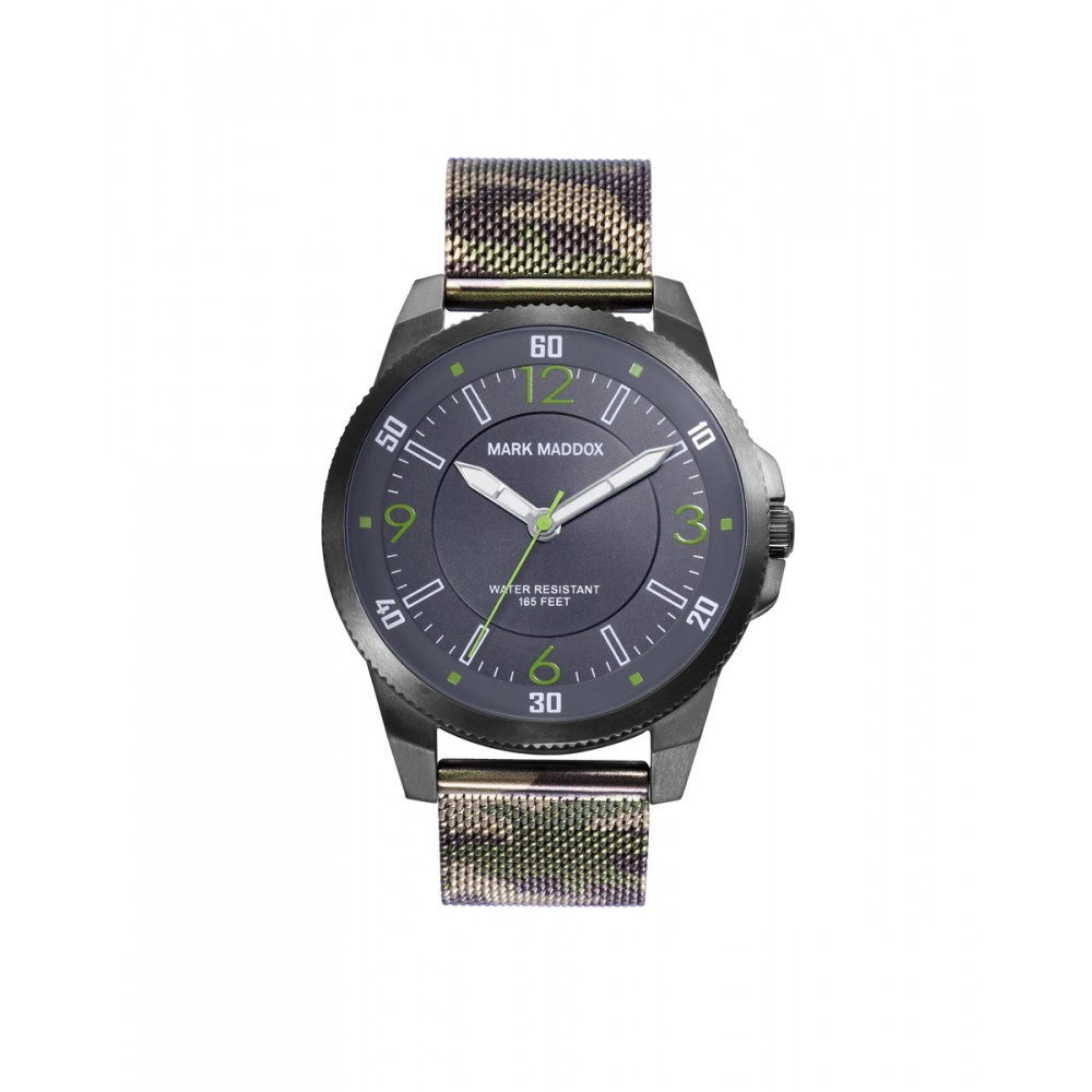 Reloj de Hombre Mark Maddox Shibuya, tres agujas , caja en acero en color gris y malla milanesa en color de camuflaje, esfera en gris, agujas de segundos en color verde con los números de esfera 12, 3, 6 y 9 en color verde
