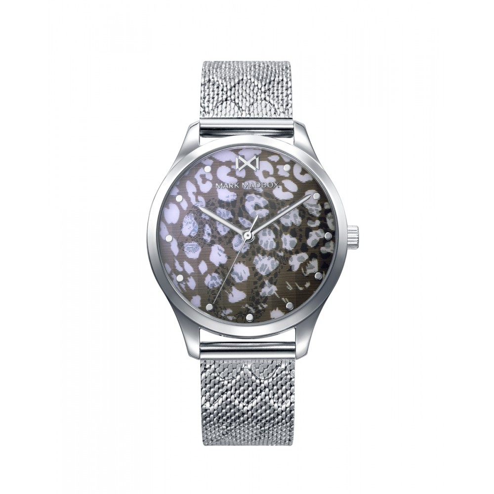 Reloj de Mujer Mark Maddox Shibuya, tres agujas , caja y malla milanesa de acero, esfera bicolor con holograma tigre blanca y negra.
