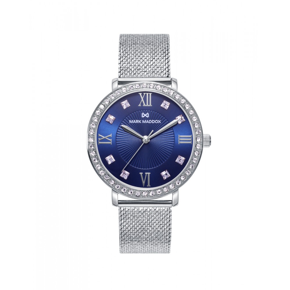Reloj de mujer Tooting Mark Maddox tres agujas, caja con circonitas y malla milanesa de acero, esfera azul con circonitas, agujas en color plata.
