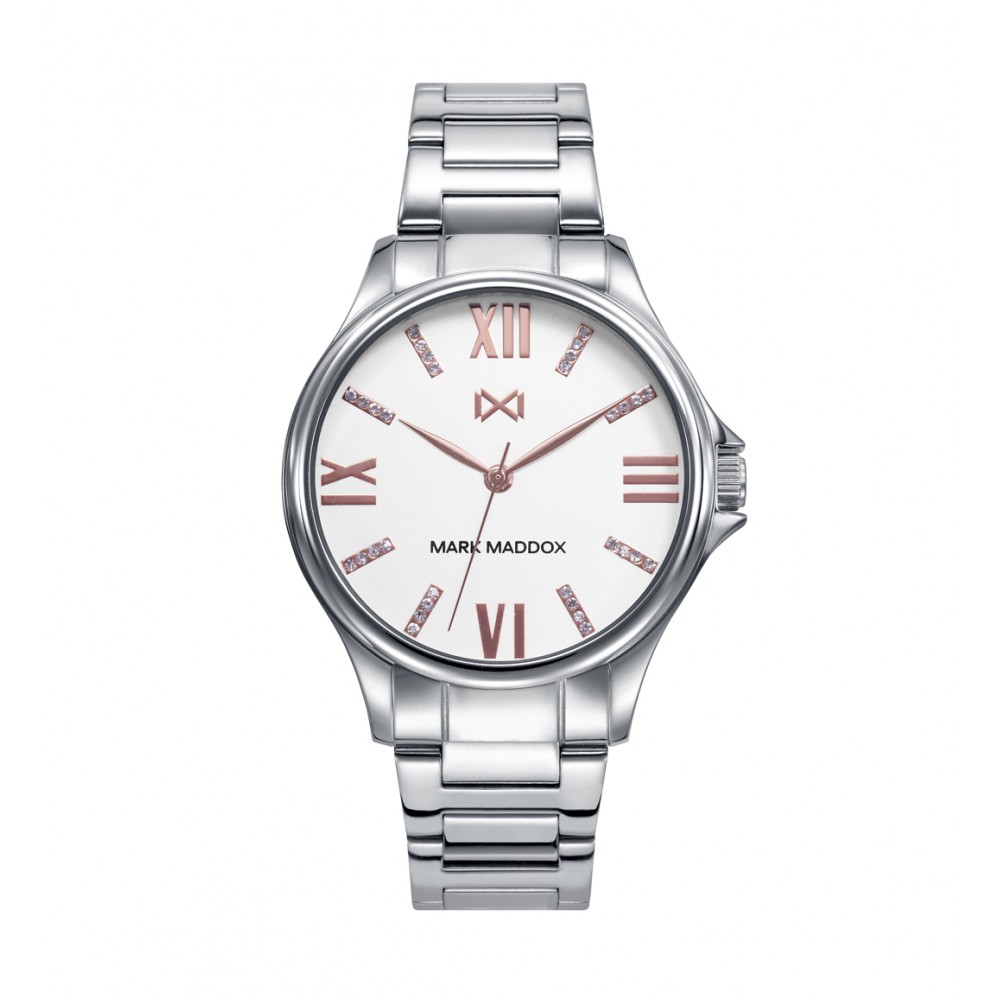 Pack de Mujer Mark Maddox Tooting con reloj tres agujas caja y brazalete en acero, esfera blanca con indices en Ip rosa y pulsera burdeos con motivo en acero