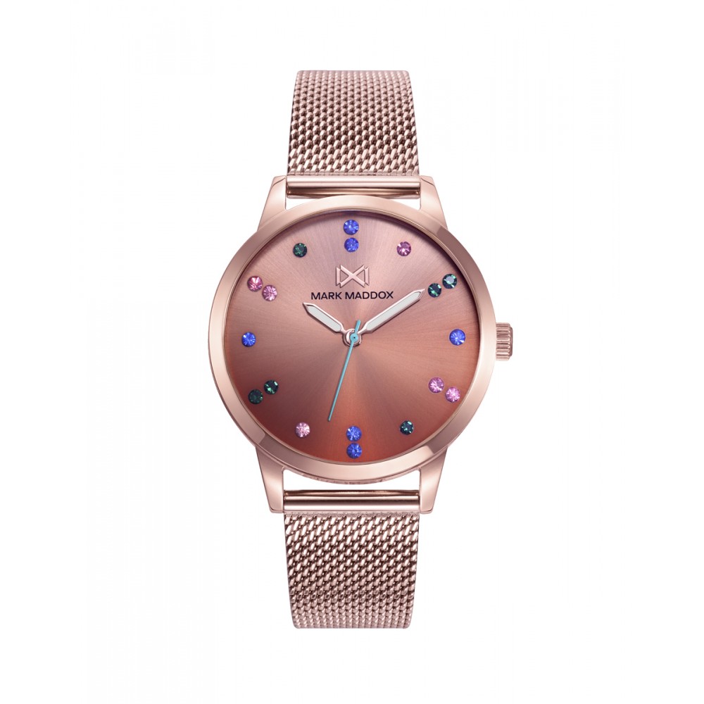 Reloj de Mujer Mark Maddox Tooting, tres agujas, caja y malla milanesa de acero en Ip rosa, esfera degradé naranja.