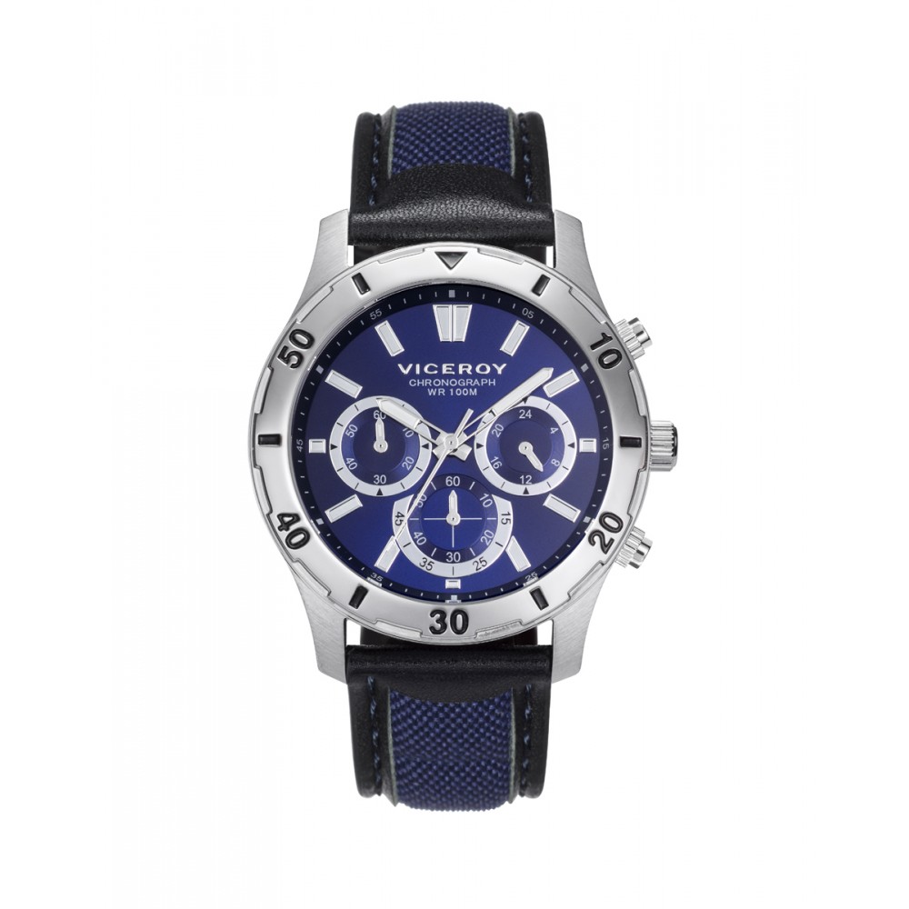 Este reloj cronógrafo para hombre destaca por su combinación de robustez y elegancia. Con una caja de acero duradera y una correa de piel negra y nylon azul, este Viceroy tanto resistencia como comodidad. La esfera azul, realzada con índices en blanco, proporciona una lectura clara y sofisticada. Los contadores, ubicados a las 3, 6 y 9 en punto, añaden precisión y funcionalidad, permitiendo medir el tiempo con exactitud. Este reloj es perfecto para el hombre moderno que valora tanto el estilo como la utilidad, siendo ideal para cualquier ocasión, desde el uso diario hasta eventos deportivos y formales.
