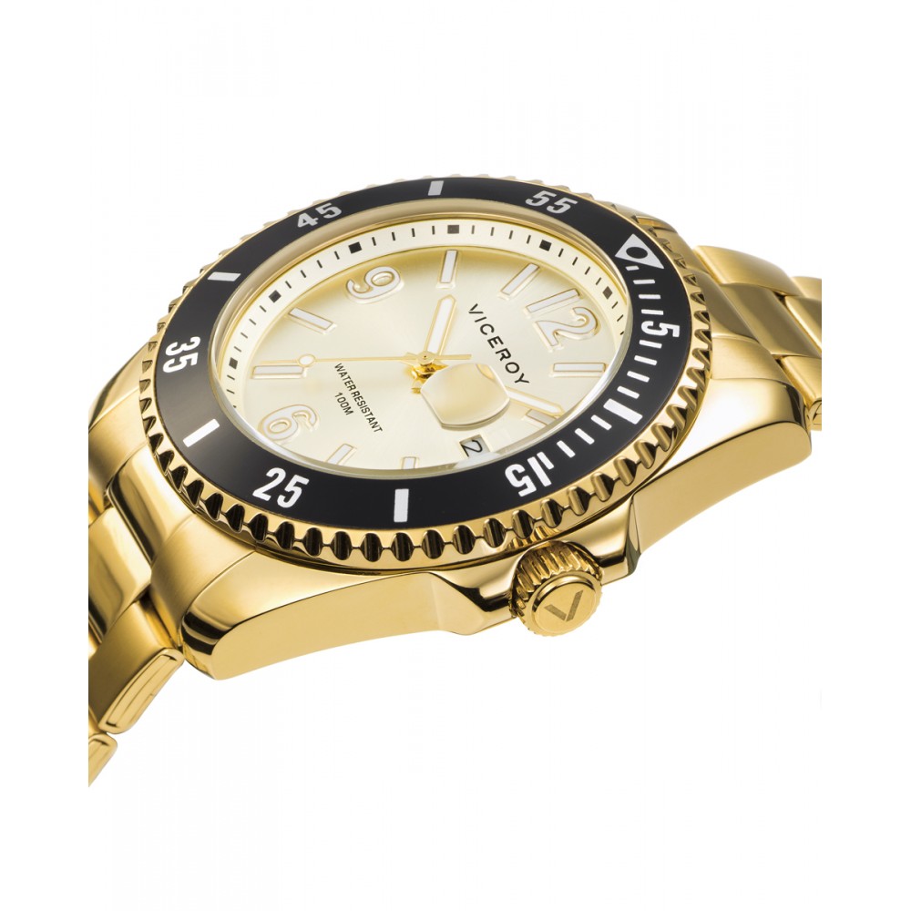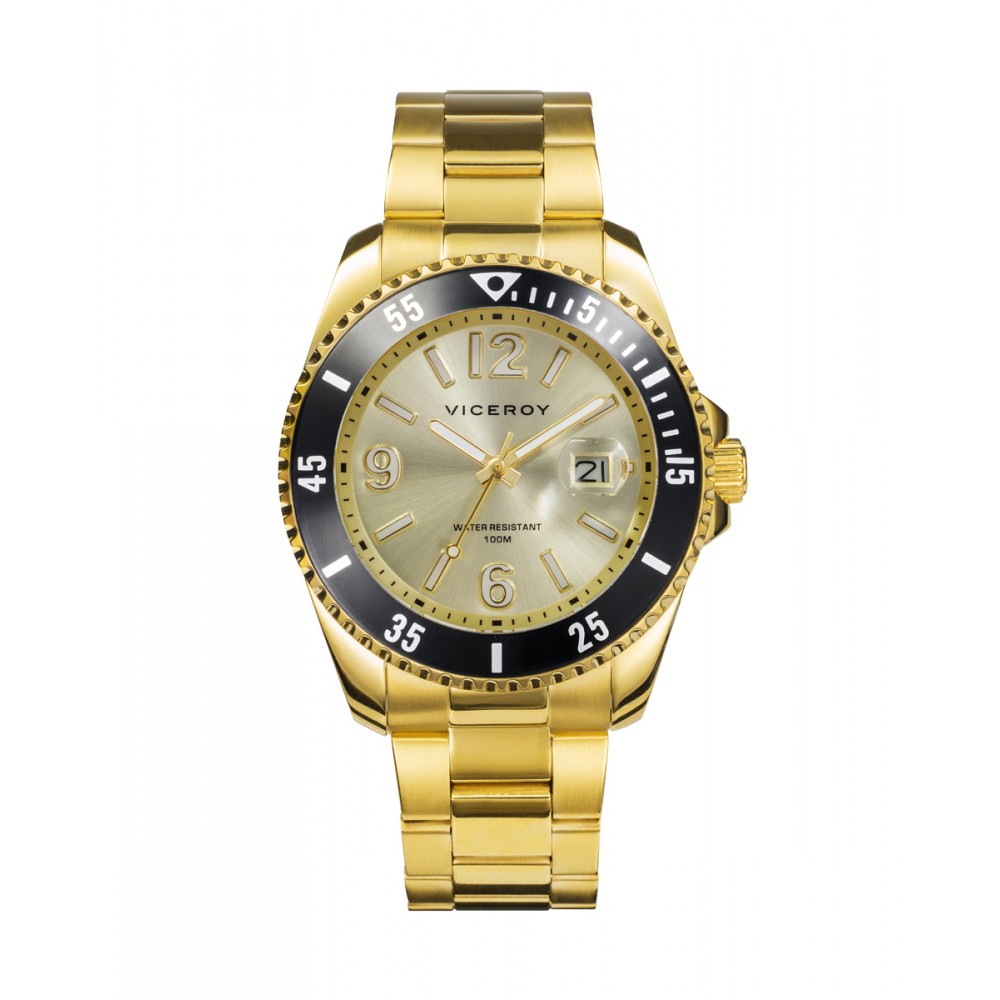 Este reloj de hombre Viceroy Heat es una expresión de lujo y elegancia. Con una caja y brazalete de acero con IP dorado, este reloj irradia sofisticación y estilo. Su bisel negro proporciona un contraste audaz y distintivo, mientras que la esfera dorada agrega un toque de glamour. El calendario a las 3 en punto añade funcionalidad, y los números en blanco garantizan una fácil lectura del tiempo. Perfecto para cualquier ocasión, el Viceroy Heat es el complemento esencial para el hombre que busca un reloj que combine elegancia y practicidad.